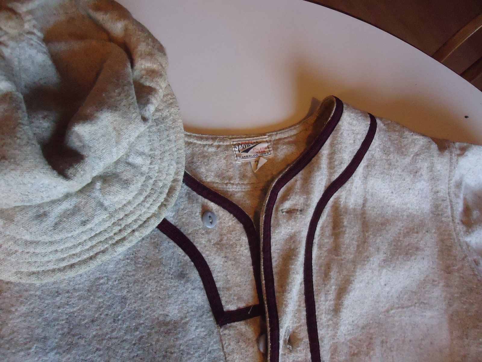 The jersey’s tag is from Powers Athletic Wear of Waterloo, Iowa – this company has been in existence since 1902. The ballcap is showing its wear in the softness of the fabric and in being misshaped (eBay image).