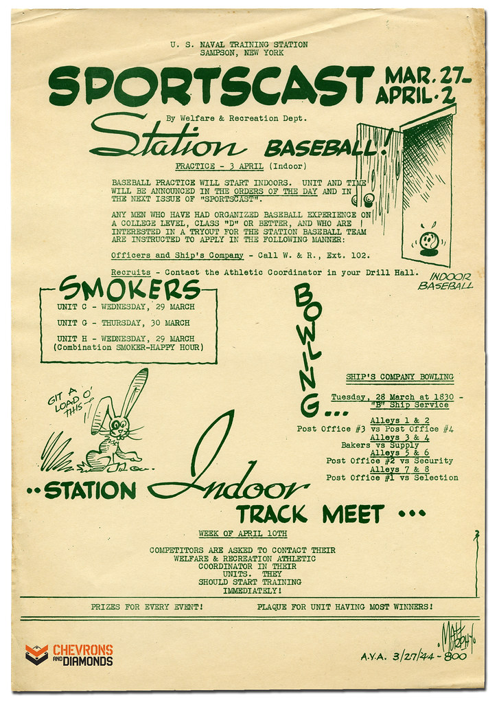 “Baseball practice will start indoors. Unit and time will be announced in the Orders of the Day and in the next issue of Sportscast.