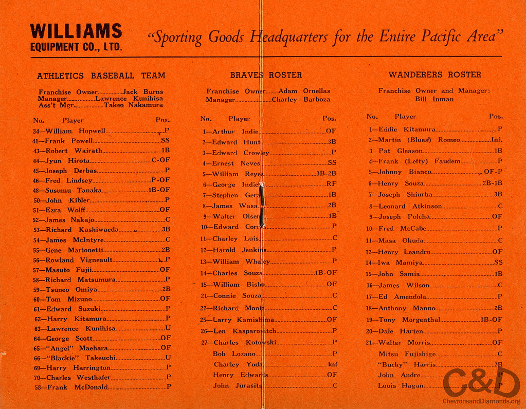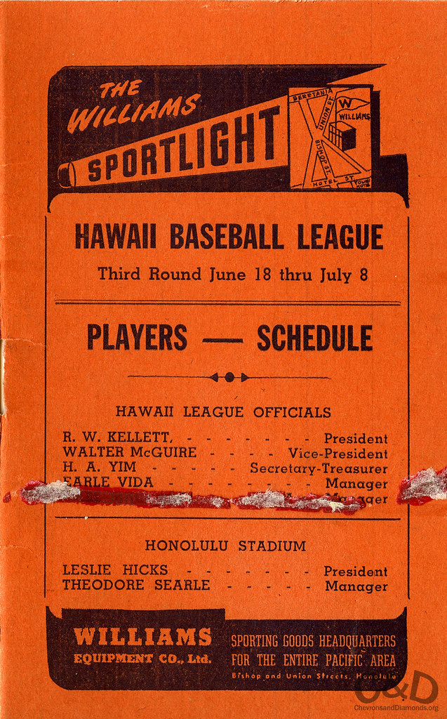Our copy of the Williams Sportlight Hawaii League roster and schedule booklet came from the personal collection of Al Brancato who played for the Pearl Harbor Submarine Base Dolphins in 1944. See the Williams Sportlight – Hawaii Baseball League Schedule, Fourth Round.