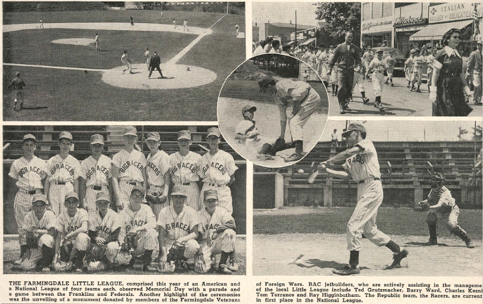 This article mentions the RAC little league team, the “Racers” who were part of the Farmingdale little league being in first place as of June 11, 1954 (courtesy of Ken Neubeck of LIRAHS).