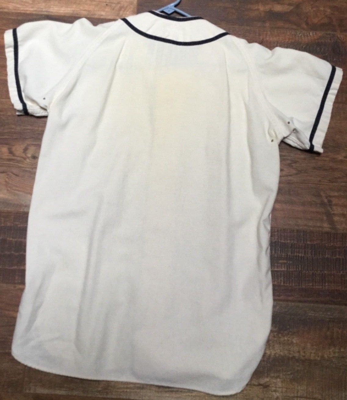 The back of the 1950s Marines home jersey lacks numerals. The armpit gussets and the broad rayon soutache are clearly visible in this photo (source: eBay image).