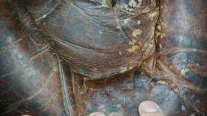 Barely discernible in this image, “Inner Processed” can be seen at the center of the palm; “A Preferred Product” trademark and “DW” are visible just above my fingertips and the “ddle” of Elmer Riddle’s signature can be seen towards the upper right. Notice the cracking and flaking dried-out leather. This was after one re-moisturizing treatment.