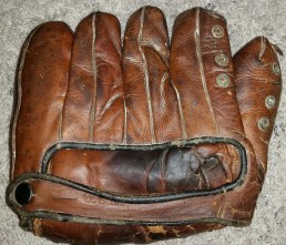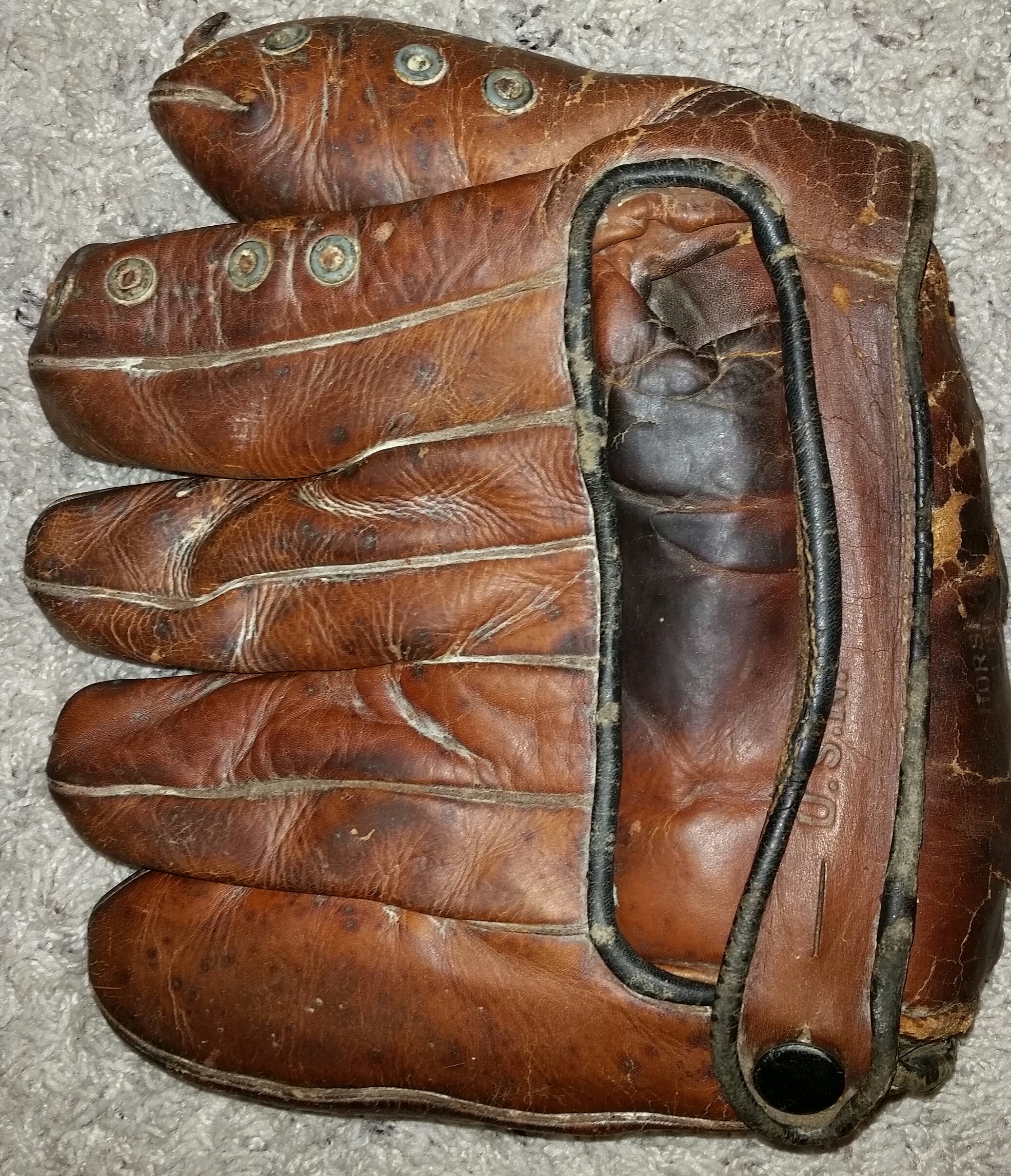 The wrist strap is slightly rolled over the “U.S.N” stamped lettering. Notice the missing webbing and lacing between the thumb and index finger.