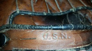 U.S.N. is stamped into the wrist strap of this 1942-44 GoldSmith DW Elmer Riddle signature model glove (Chevrons and Diamonds Collection).